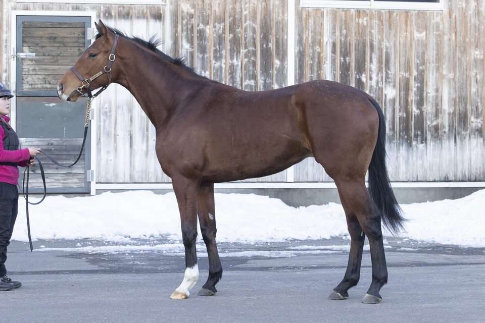 密かに期待している馬。コメントでは背中の良さを常に褒めてもらえており、ここまで順調に進んでいる。早期の移動も期待されるが、馬体はまだノッペリとしており、まだ良くなる余地を残している印象。動画は力んで走っているようにも見えるので、さらにペースをあげてどんな走りをしてくれるか、期待4割、不安6割という状態。今年の目標は箸にも棒にもという状態でないこと、できれば1勝を期待したい。